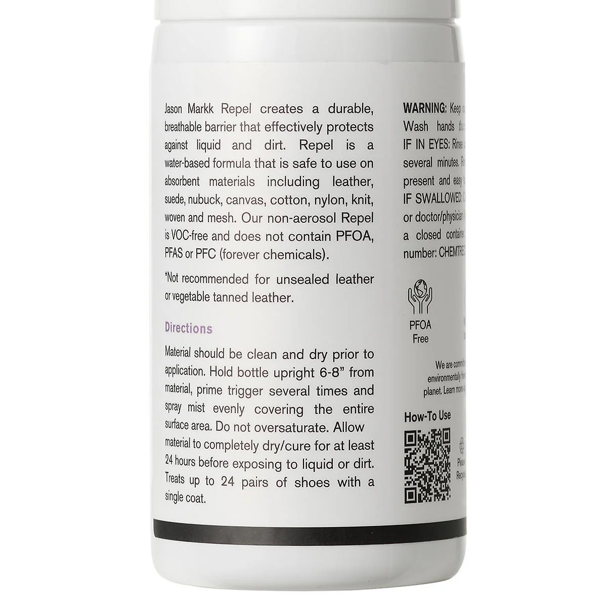 Jason Markk Repel creates a durable, breathable barrier that effectively protects against liquid and dirt. Repel is a water-based formula that is safe to use on absorbent materials including leather, suede, nubuck, canvas, cotton, nylon, knit, woven and mesh.